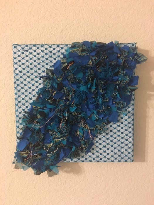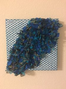- Alisa Otto “Fluff” 2017, Fabric scraps, metallic thread; 12” x 12” x 1.5”. Elizabeth Baum “Untitled” 2017, Artist-dyed, printed, painted fabrics, plastic craft lacing; 12” x 12” x 1.5”