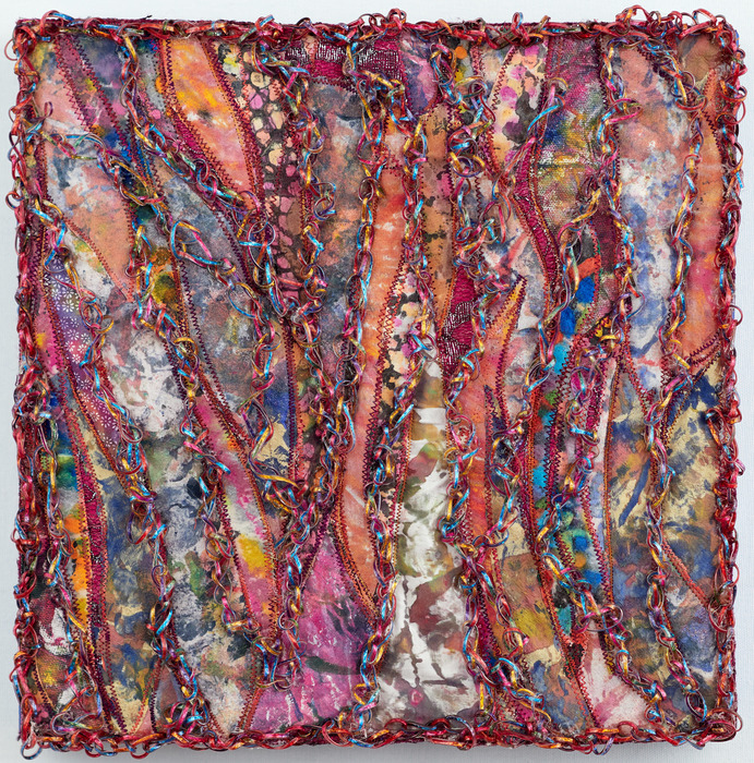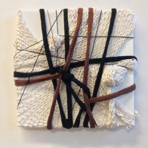 - Elizabeth Baum “Untitled” 2017, Artist-dyed, printed, painted fabrics, plastic craft lacing; 12” x 12” x 1.5”.