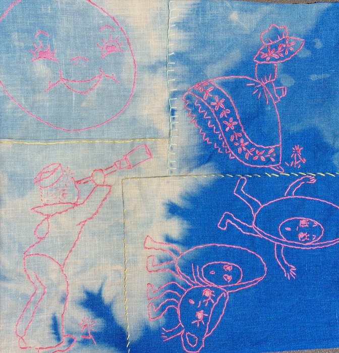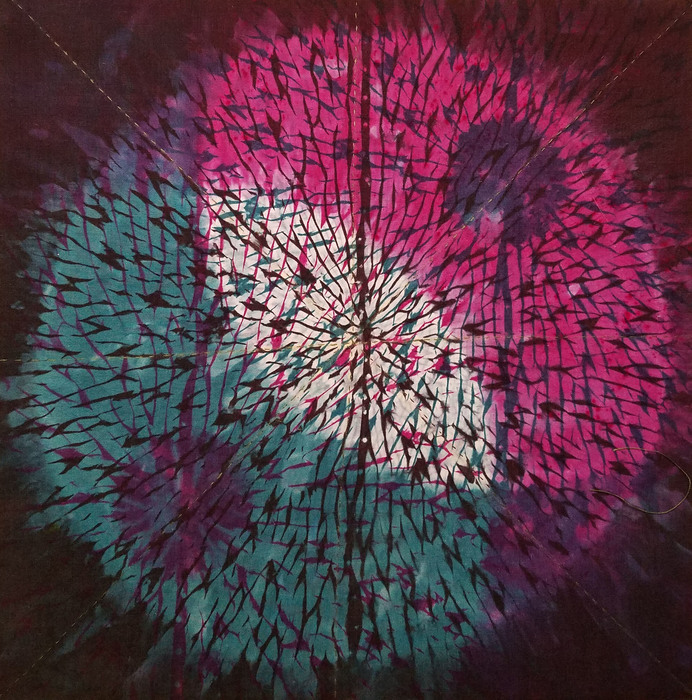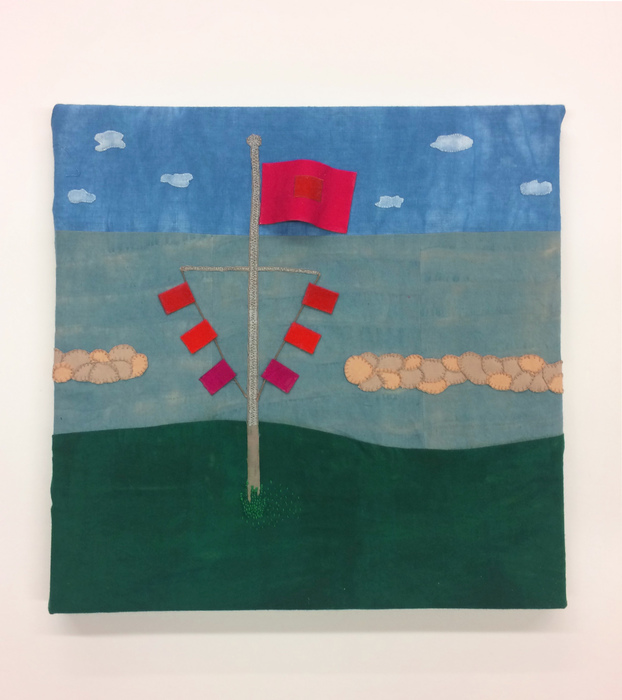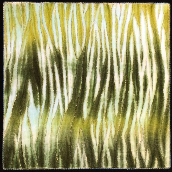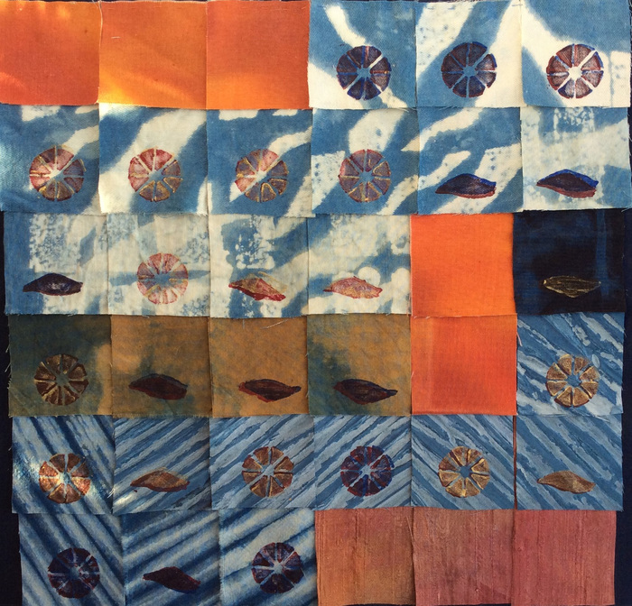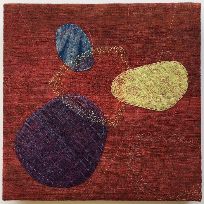 - Maggie Sasso “Signaling” 2017, Shibori and hand dyed fabric, embroidery; 12” x 12” x 0”. Website: www.maggiesasso.com