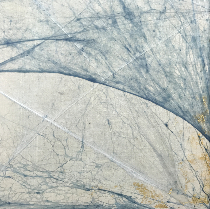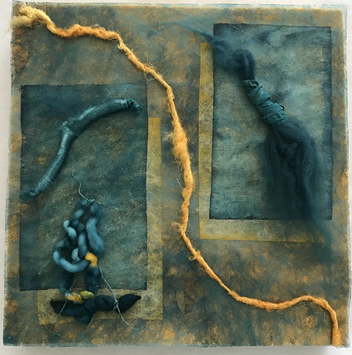 - Sheri Levin McNerthney “Seascape” 2017, Silk fiber, natural indigo, 24k gold leaf; 12” x 12” x 0”