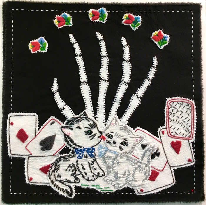 - Maggy Rozycki Hiltner Love Gambled and Lost 2017, hand-stitched cotton and linen, found embroidery, 12” x 12”.