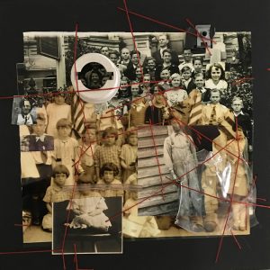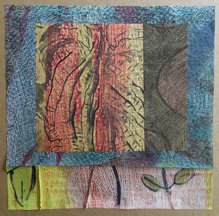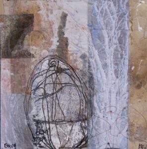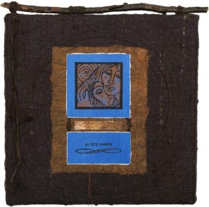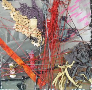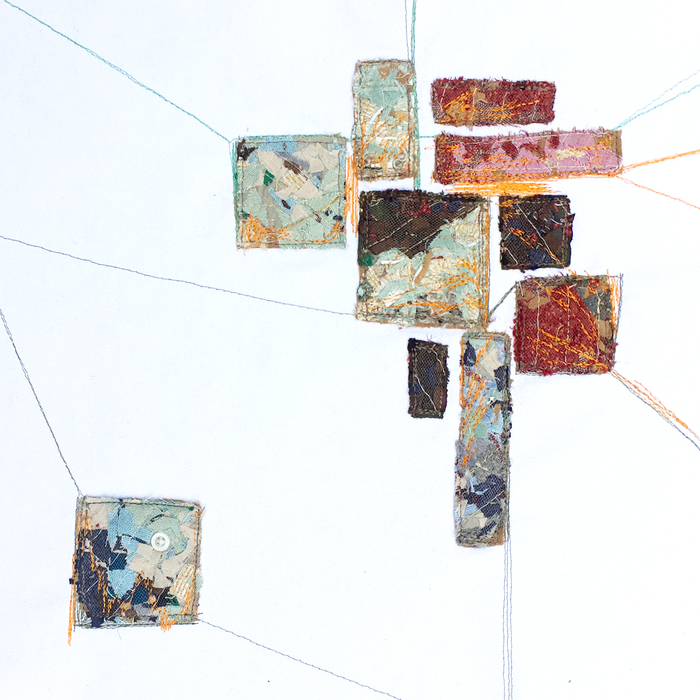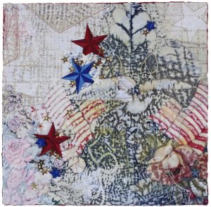 - Karen McCarthy “Deliberate Wanderings, #14” Collage construction, printed, painted, distressed, stitched; 12” x 12” x 1.5”. Website: www.karenmccarthyart.com