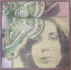 - Mickie McCormic “Rosalie’s Moth” 2017, Image transfer, quilted and embroidered; 12” x 12” x 1.6”. Website: www.mickiemccormic.com