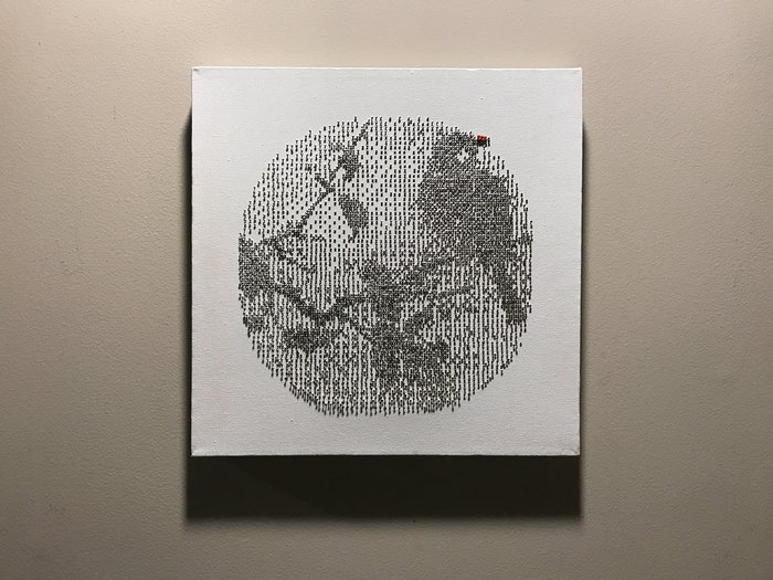 - Xia Gao “Breath. Gaze” 2017, Pin, canvas; 12” x 12” x 1.5”. Website: www.msu.edu/~gaox