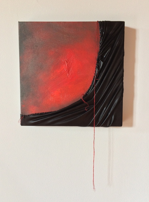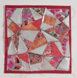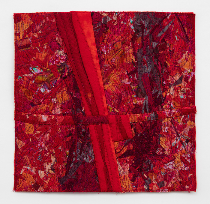 - Patricia Malarcher “Red Alert” 2016, Fabric, Mylar, laminated paper, thread, 12” x 12” x 1.5”