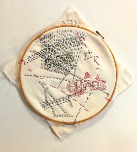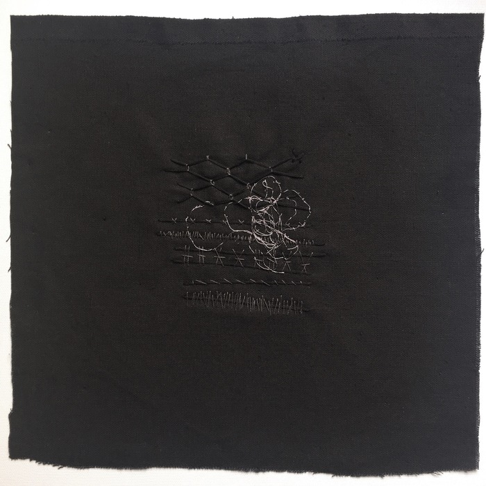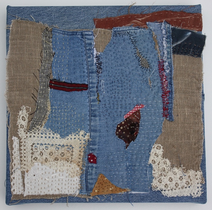 - Helen Geglio “Mending Fragment 2” 2016, Cotton, linen, hand embroidered and stitched; 12” x 12” x 1.5”. Website: www.helengeglio.com