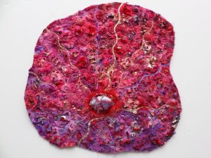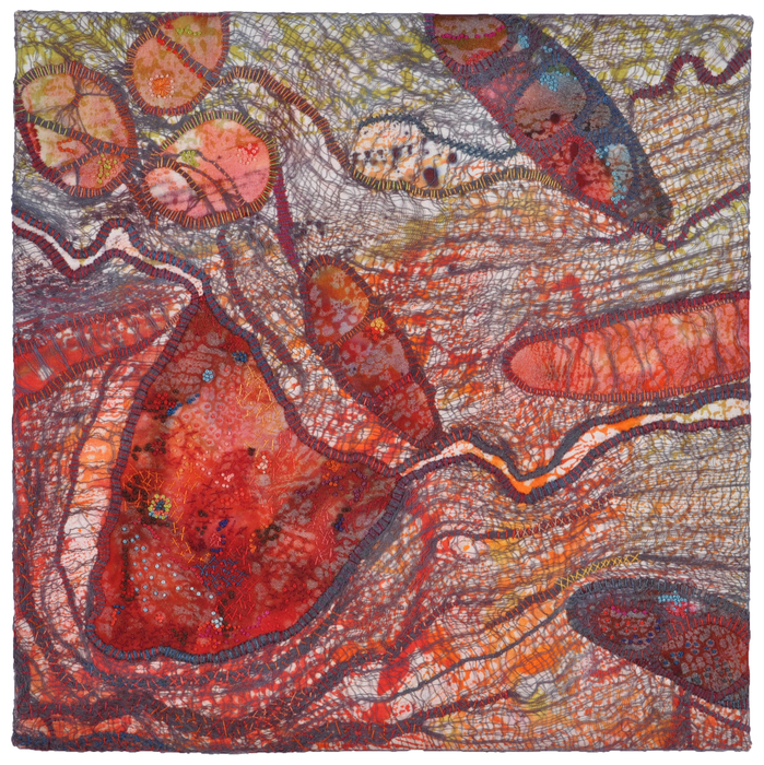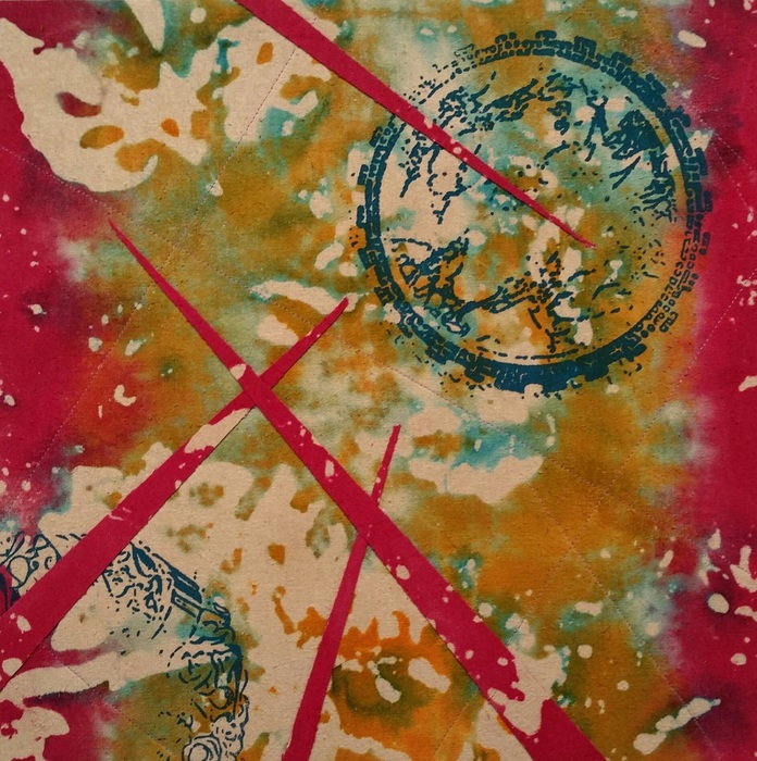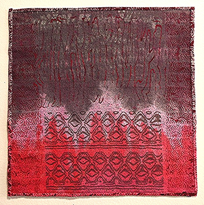 - Nancy Crasco “Red Vortex” 2016, Stitched Monoprint, 12” x 12” x 0”. Website: www.nancycrasco.com