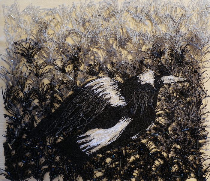 - Sharon Peoples “Death of a Magpie in Winter” 2017, Machine embroidered lace, 6.75” x 7.5” x .25”. Website: www.sharon-peoples.com