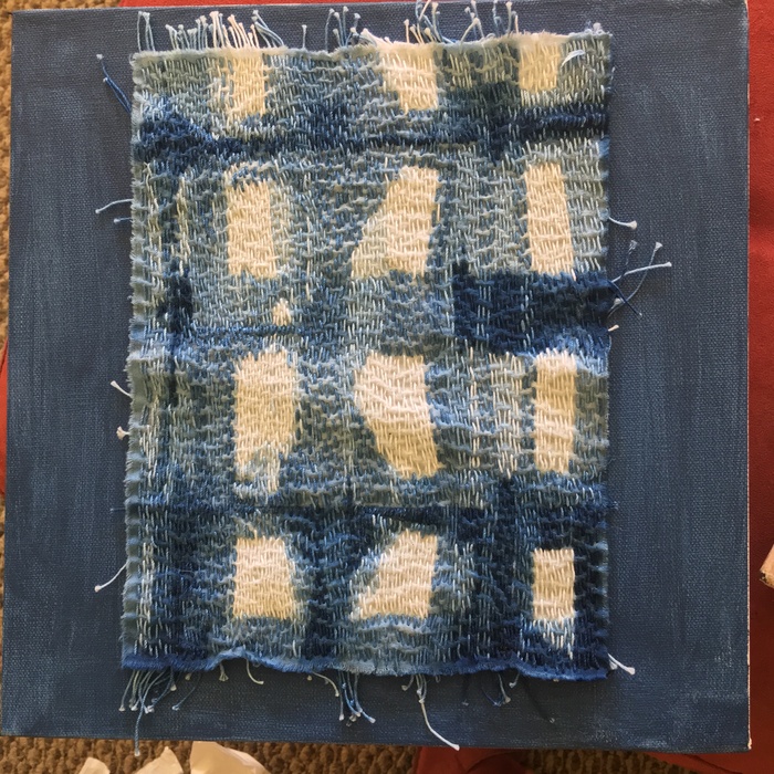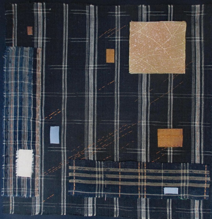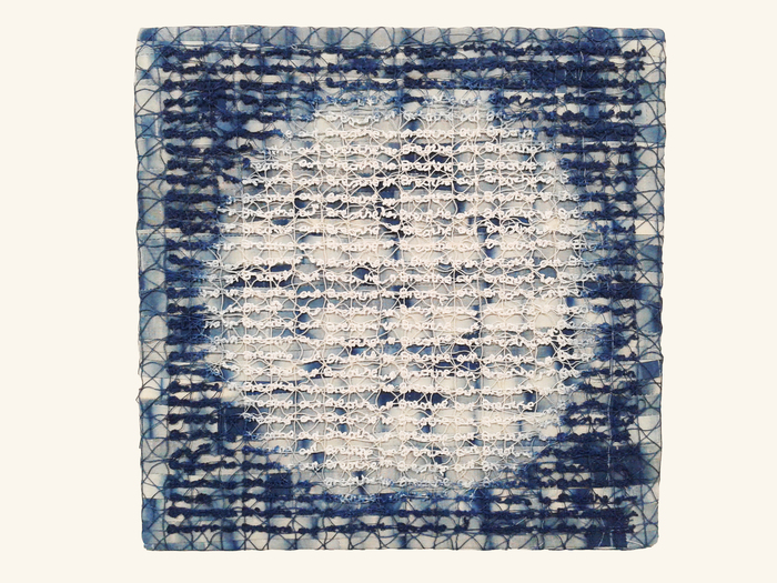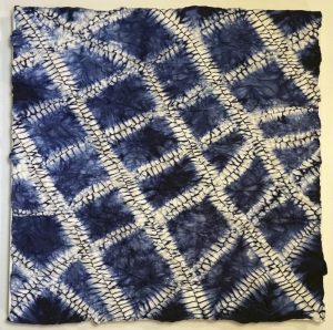 - Cathy Wilkerson “Panes” 2017, Indigo, shibori, embroidery; 12” x 12” x 1.5”.