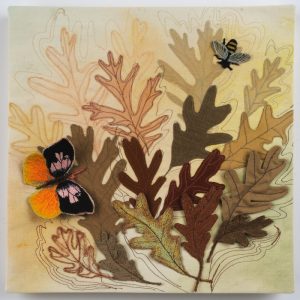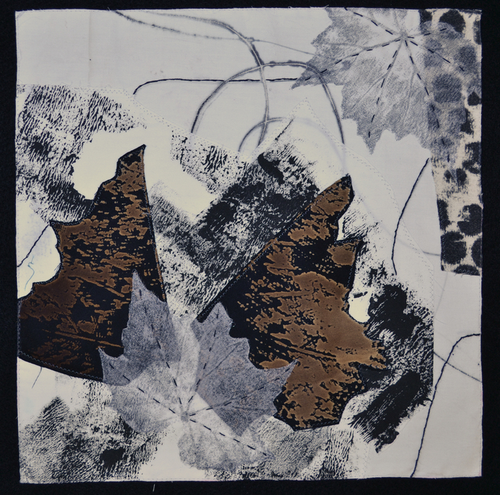 - B J Adams “Leaves of Fall” 2017, Mixed, embroidery, applique, quilting, a painted background; 12” x 12” x 0”. Website: www.bjadamsart.com