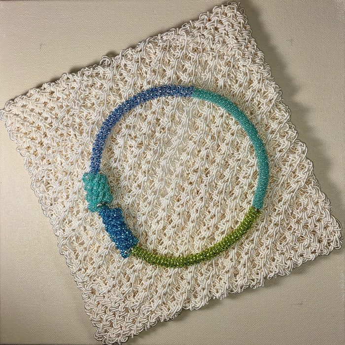 - Marie Ozmon “Coiled Bead and Wire Necklace on Crocheted Satin Cord” 2016-17, Jewelry and textile, 12” x 12” x 2”. Website: www.marieozmon.com