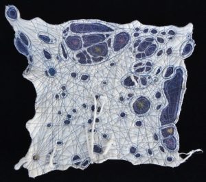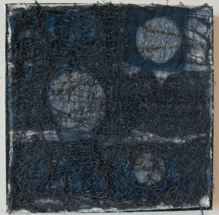 - Susan Avila “Light at the End of the Tunnel” 2017, Thread, recycled muslin, indigo dye; 12” x 12” x 1.5”. Website: www.suta.com