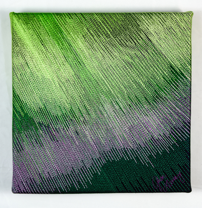 - Sandra Brick “Intersectionality” 2017, Bamboo rayon, silk thread, MX dyes; 12” x 12” x 1.5”