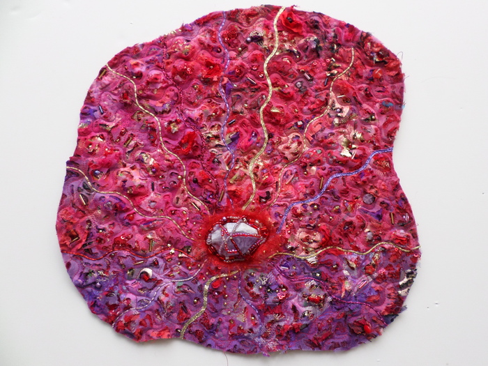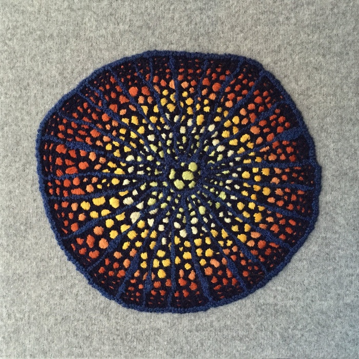 - Teresa Shields “Green Yellow Orange Cell Structure” 2015, French knots and embroidery; 8” x 8” x 1”. Website: http://www.teresashieldsart.com