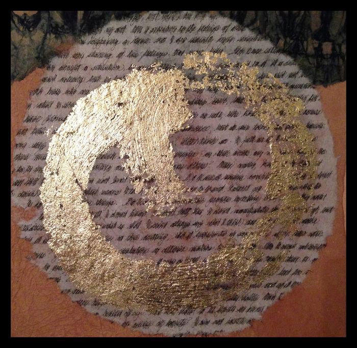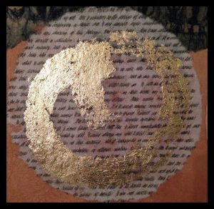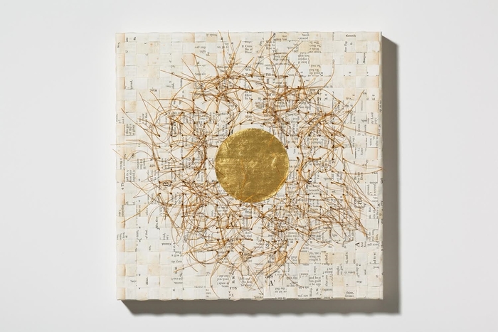 - Carole Kunstadt “Sacred Poem XC” 2015, Gold leaf, thread, paper: pages Parish Psalmody 1849; 12” x 12” x 1.5”. Website: www.carolekunstadt.com