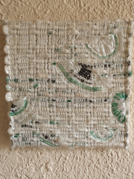 - Penny Collins “We Heart the Earth” 2017, Woven plastic on cotton warp, 12” x 12” x 1.5”.