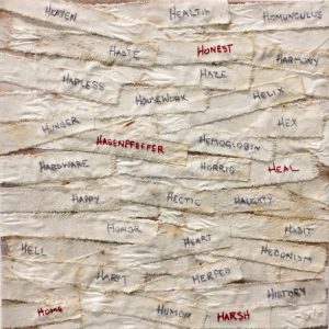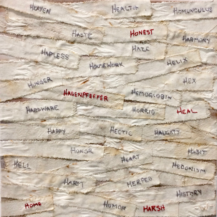 - Wynne Reynolds “H is for…” 2017, Mixed media: embroidery on linen; 12” x 12” x 1.5”. Website: www.artsandcraftslab.com