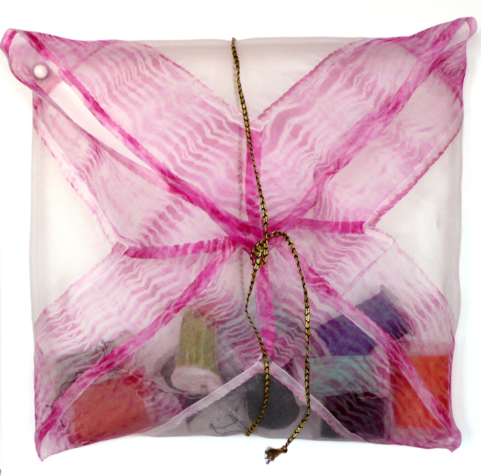 - Saberah Malik “My Sewing Pouch” 2016, Silk Organza, Immersion dye, ink, cord; 12” x 12” x 3”. Website: www.saberahmalik.com