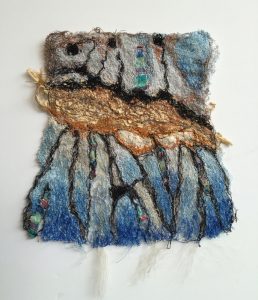- Christine Miller “Discovered Artifacts” 2017, Woven metal, resist dyed felt, hand stitching; 12” x 12” x 1.5”. Website: www.explorefiber.com