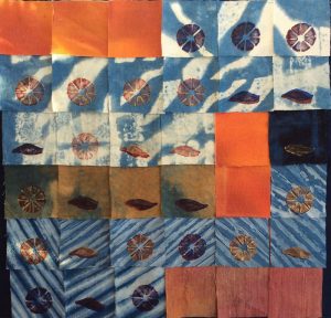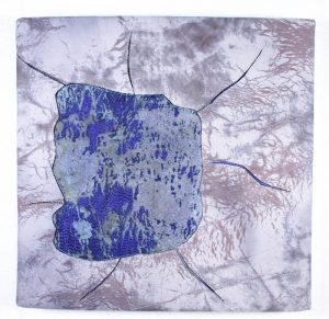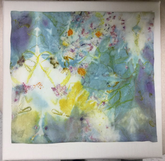 - Peggy Cox “Blue Garden #5” 2017, Eco print and embroidery on silk mounted on canvas, 12” x 12” x 0”.