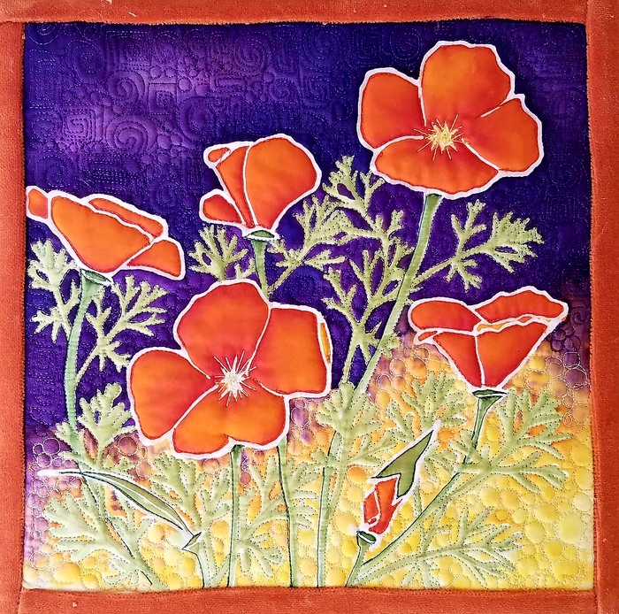 - Gail Wild “Wild California Poppies” 2017, Silk paint quilted to rayon velvet, 12” x 12” x 1.5”.