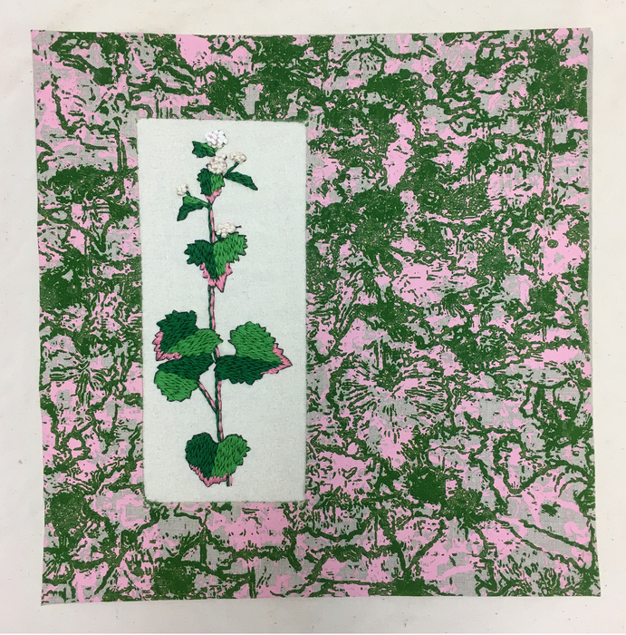 - Julie Tourtillote “Garlic Mustard” 2017, Screenprint and embroidery on linen, 12” x 12” x 1.5”.