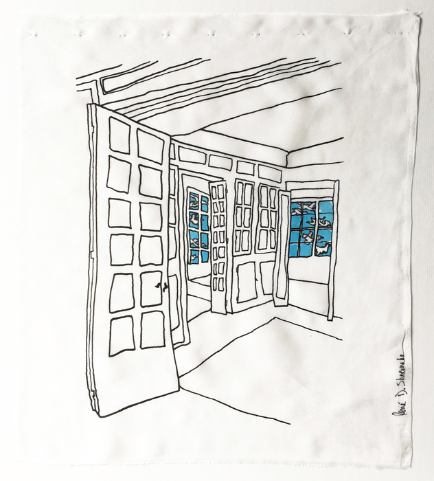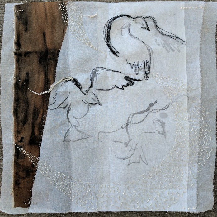 - Linda Coe “Letters Home, 1977” 2017, Surface design, toner transfer and stitching on linen; 12” x 12” x 1.5”. Website: www.lindafineart.ca