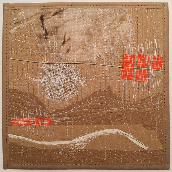 - George-Ann Bowers “Palm Canyon” 2015, Mixed fiber: thread, paper, fabric, machine stitching; 8” x 5.5” x 0”. Website: www.gabowers.com