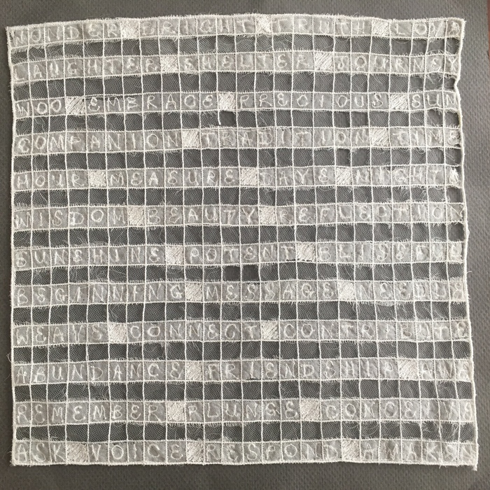 - Maura Donegan “Wonder” 2016, Tulle, silk organza, rayon thread; 10.5” x 10.5” x 0”. Website: www.mauradonegan.com