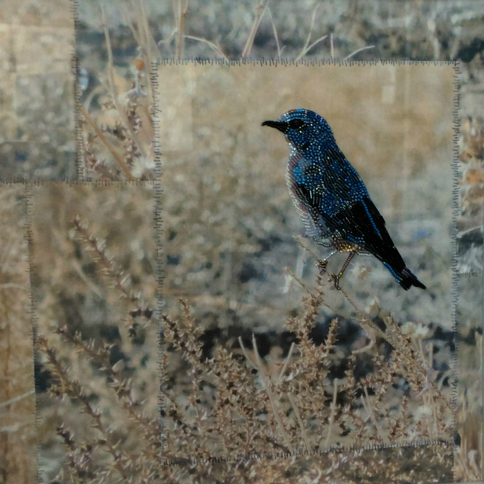 - Kathy Mitchell-Garton “Mountain Bluebird” 2017, Fabric, bead & thread embroidery; 12” x 12” x 0”. Website: kathymitchellgarton.com