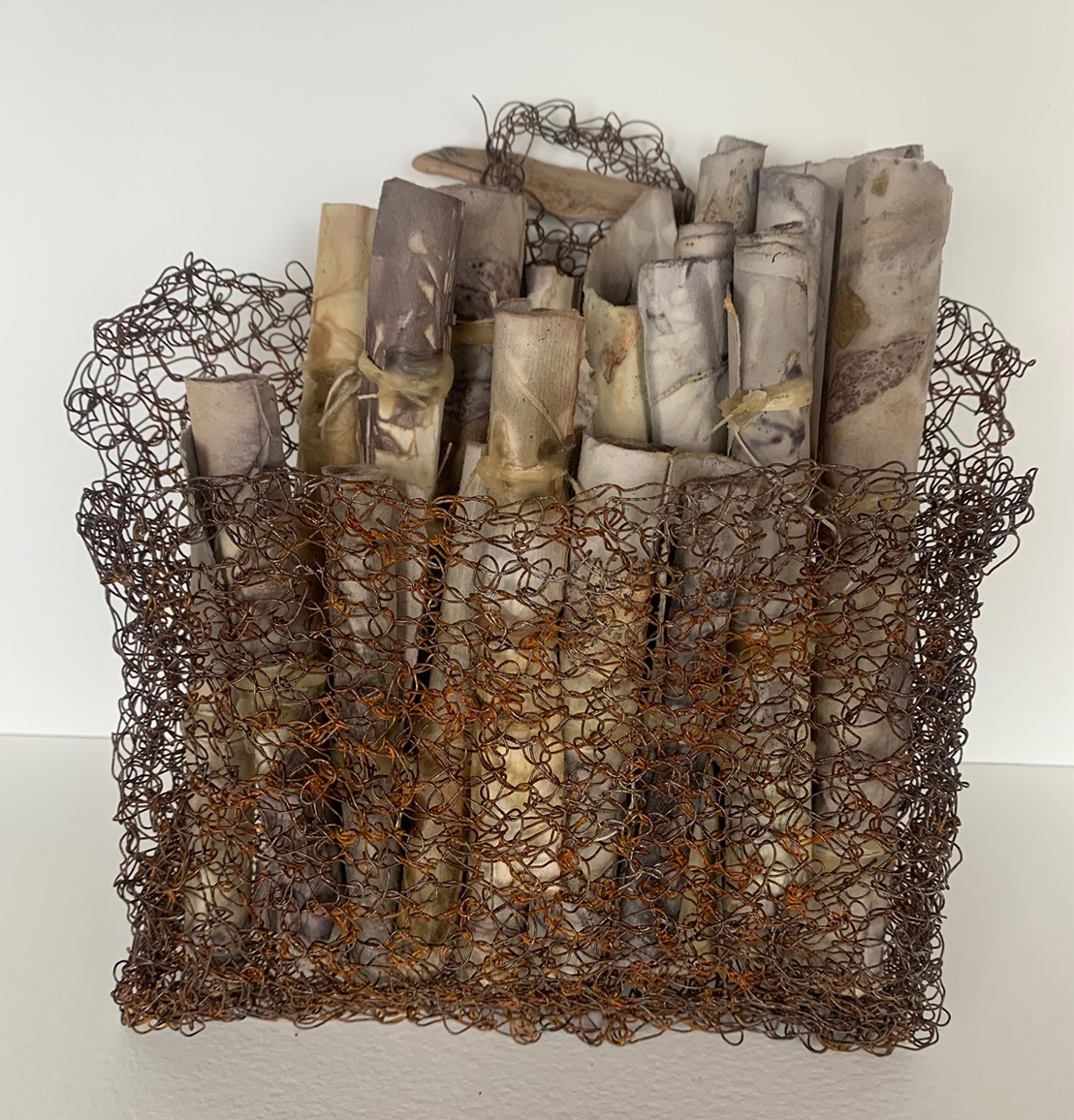 Mixed Media piece using wire that was crocheted into a pouch and left to rust. The piece is filled with eco-dyed scrolls that are tied and sealed with beeswax. www.annemcmillanart.com