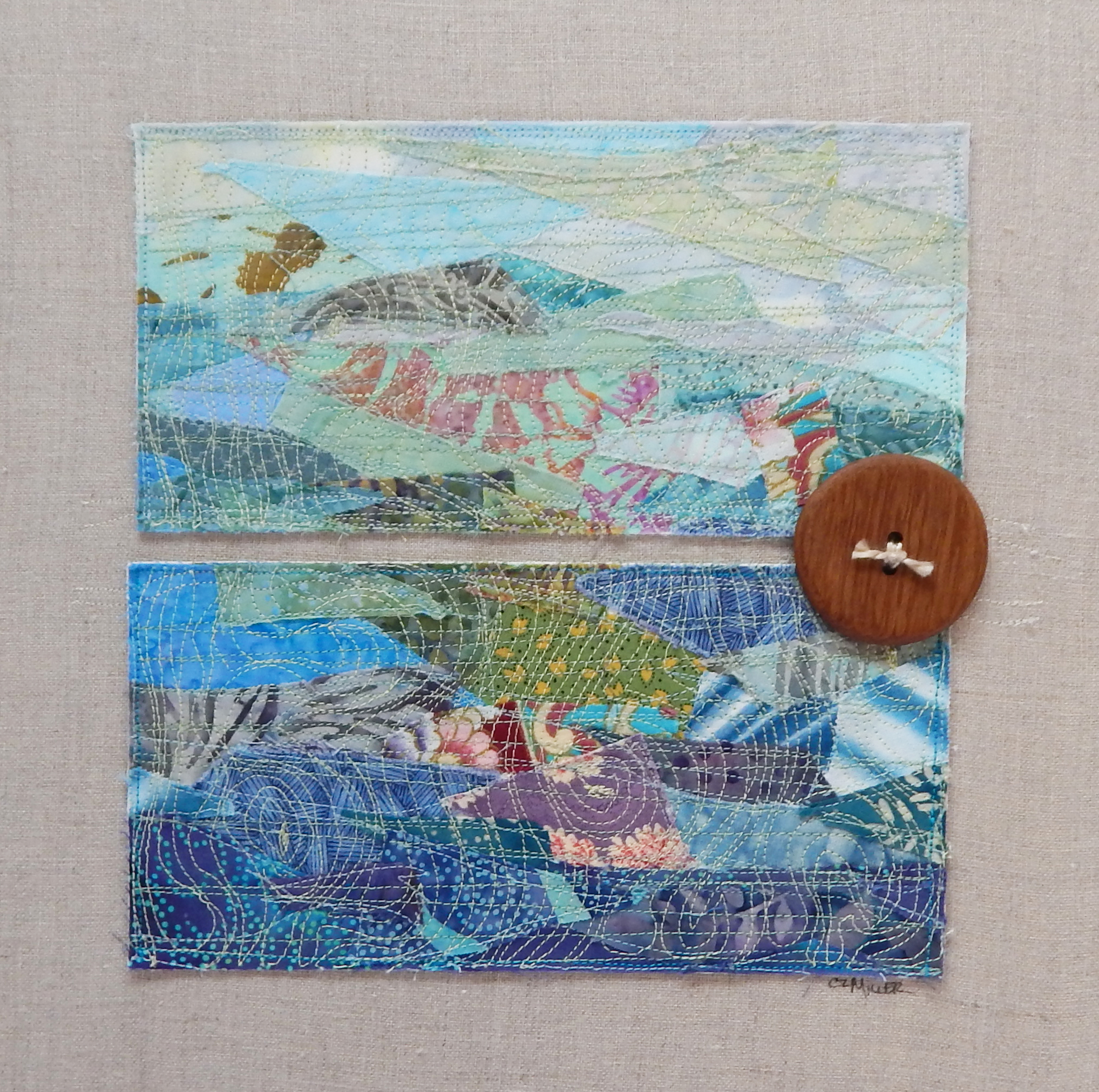 This piece is an abstract landscape divided in two horizontally but joined by a wood button. It captured my feelings at the time about what the world and the US felt like - 2 worlds divided but also joined by things we have in common. Fast forward to 2020 and this piece could also describe life before and after Covid. www.cherylzmillerart.com