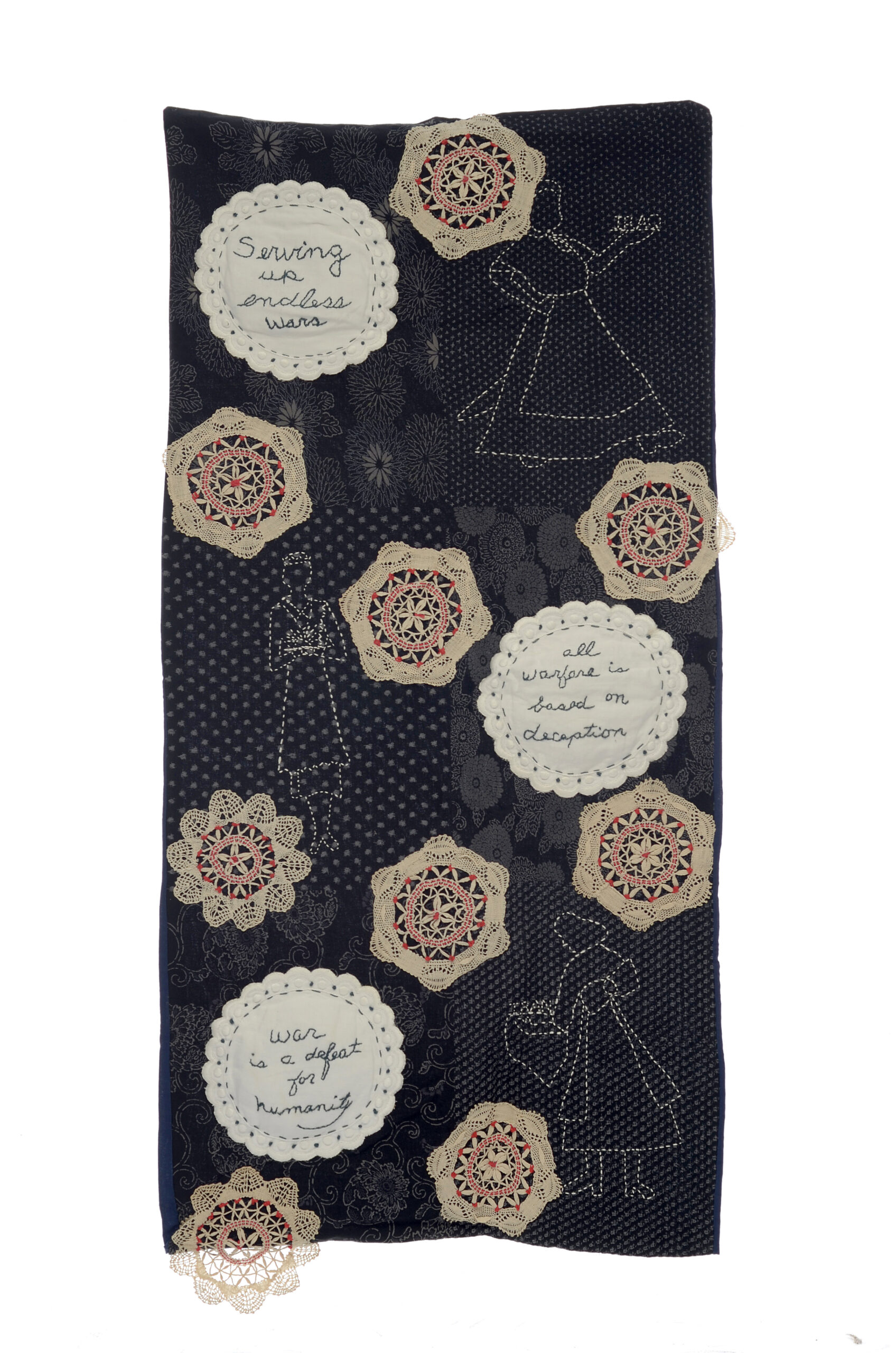 Fabric, embroidery floss and found objects (45" x 20")