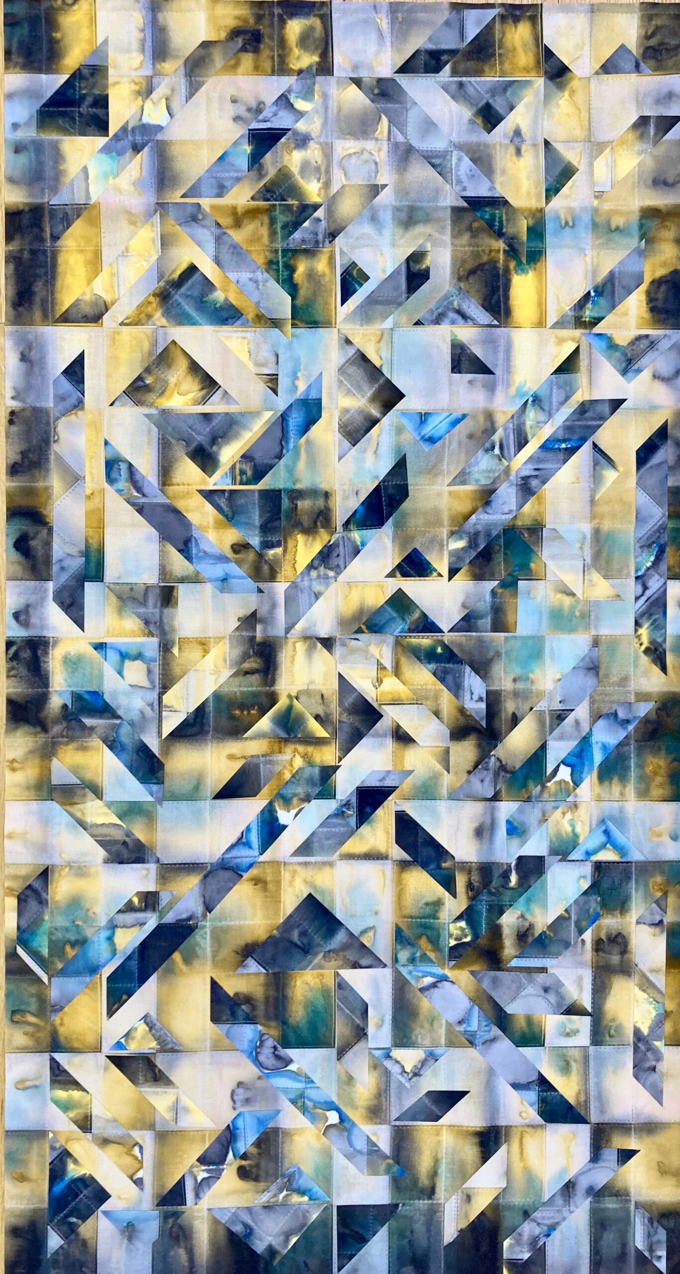 Although the center component of this piece I had painted previously, the construction of this work happened during the depth of the Pandemic. Since I could not get to a store for materials, I used what I had on had to create the color-way by ripping apart previous work and disassembling clothing. This was a lesson in going with the flow of things in the midst of a tension filled time. www.janebalshaw.com