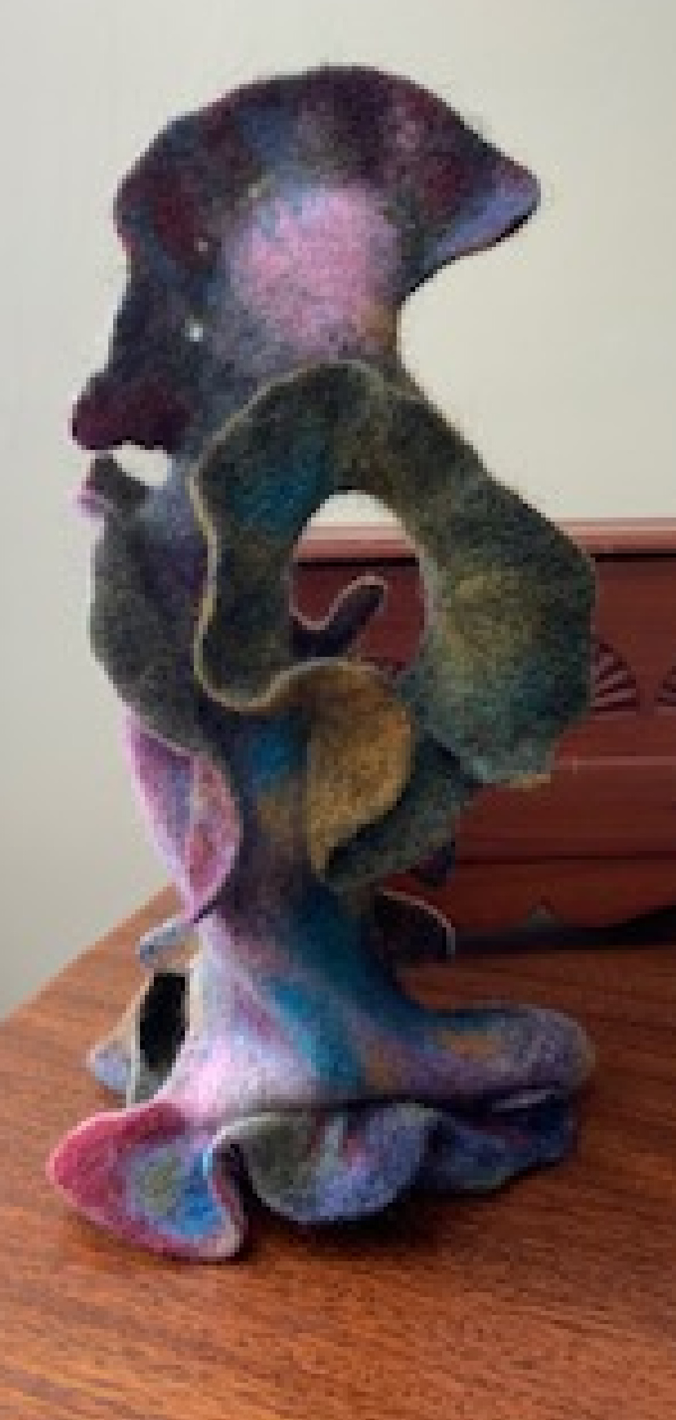Wool, mixed yarns & threads, buttons & beads, wire, polyester stuffing (9" x 18" x 18")