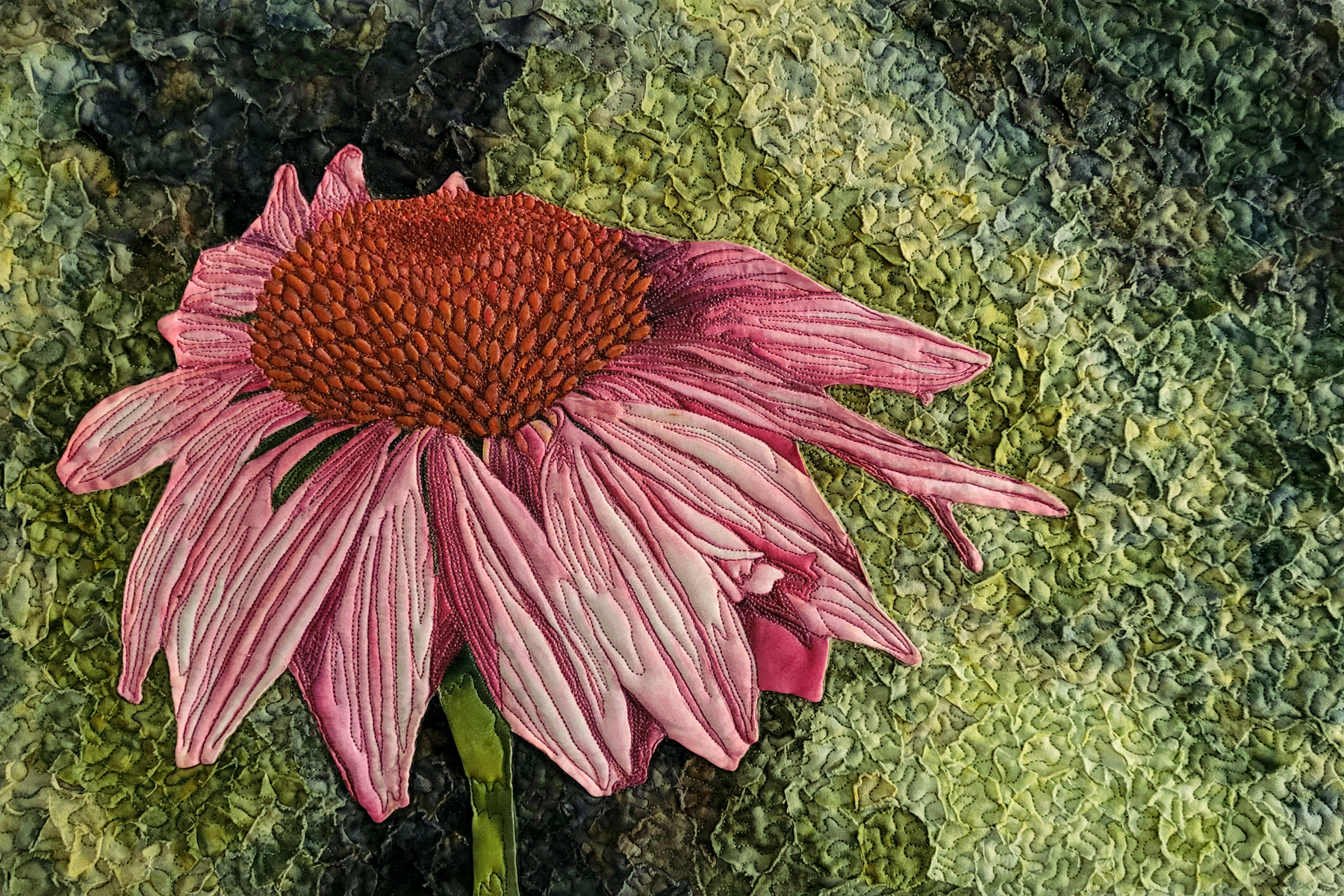 The coneflower is hand painted on silk & appliqued onto a background of arranged pieces of batik fabrics. The quilting was was done on a long arm quilting machine. Facebook: Zimmerlady Creations
