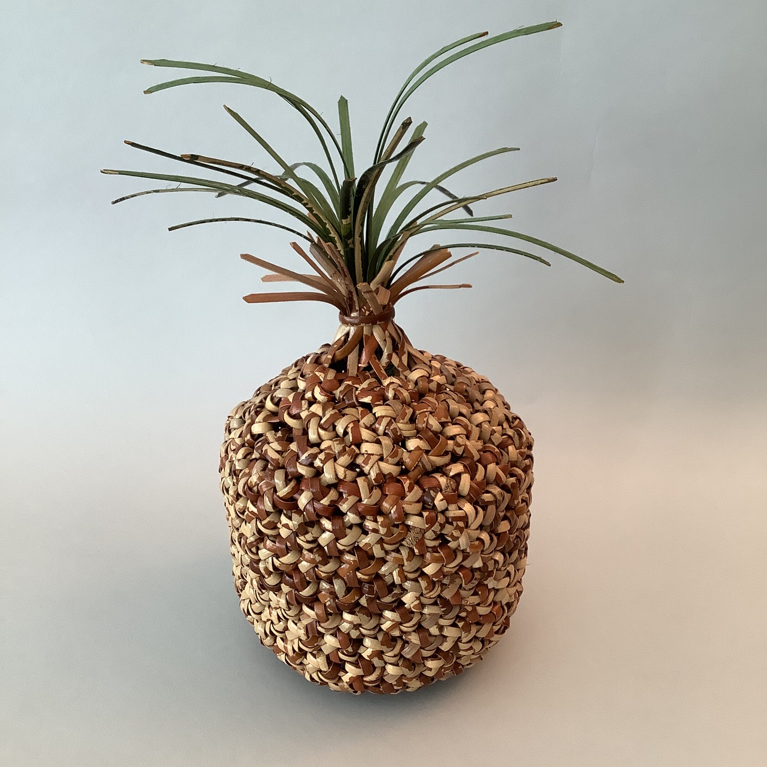 Japanese flower knot technique was used for utilitarian bags and coal scuttles. Exotic pineapples, both real and house decor, were a traditional sign of welcome to visitors. Mine mimics nature in plaited cane and welcomes guests to my new studio. 236 individual hexagonal plaited flower knots make up the form.