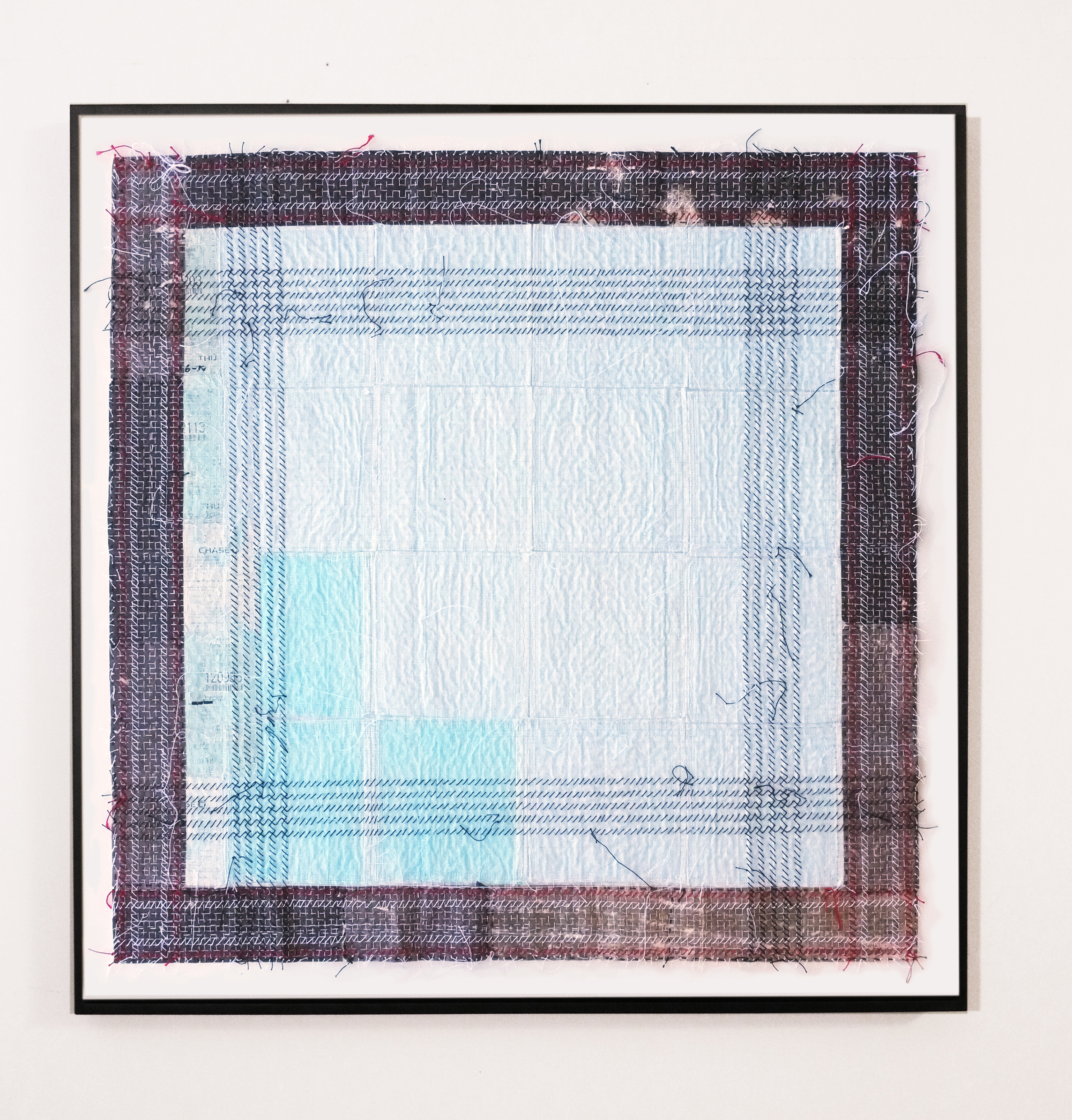 "Consuming Memories #14" is a mixed-media collage of the artist's previously worn face mask from the pandemic and paper receipts. The pieces are sewn together by hand with criss-cross stitches using various colors of thread.