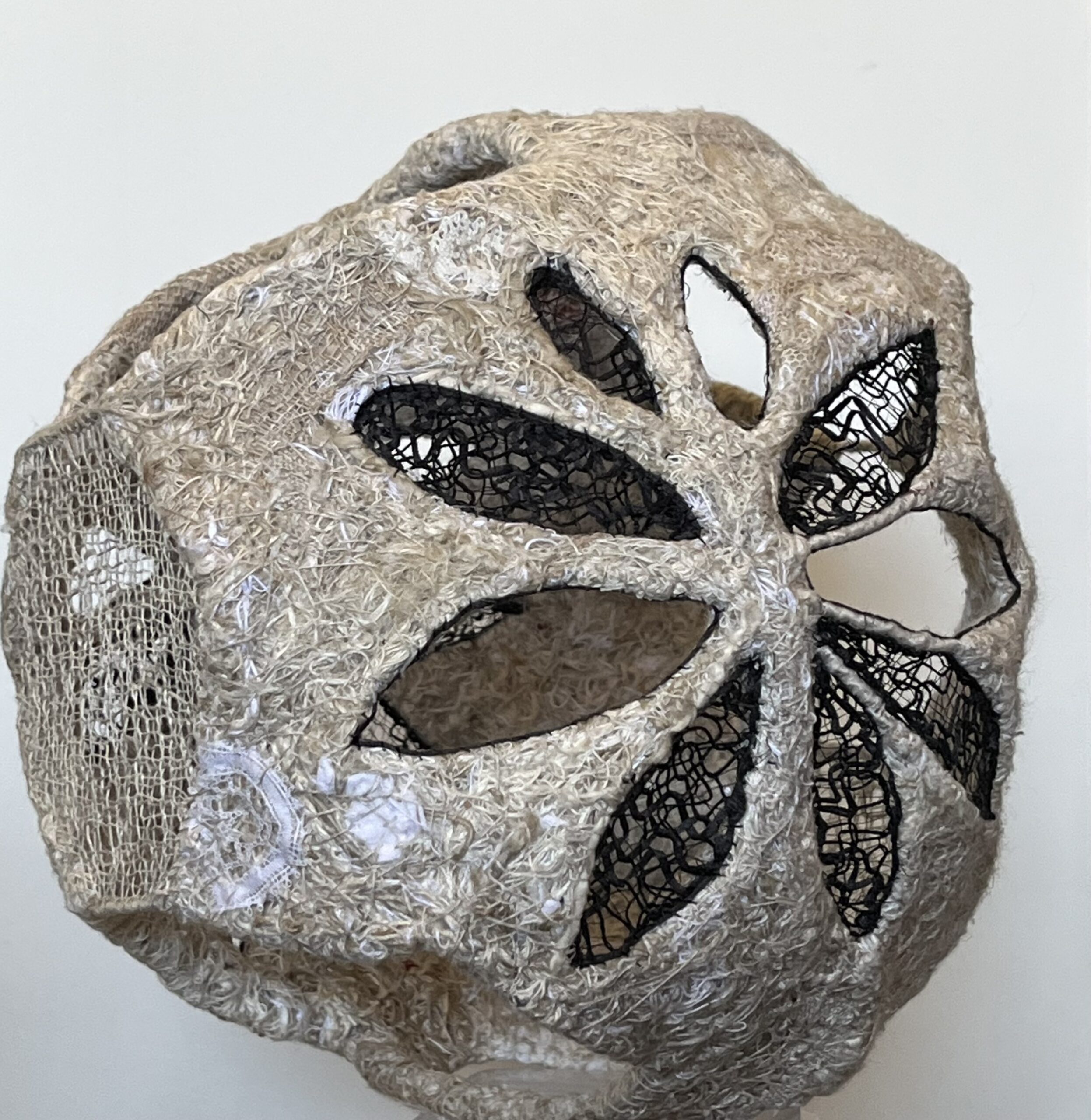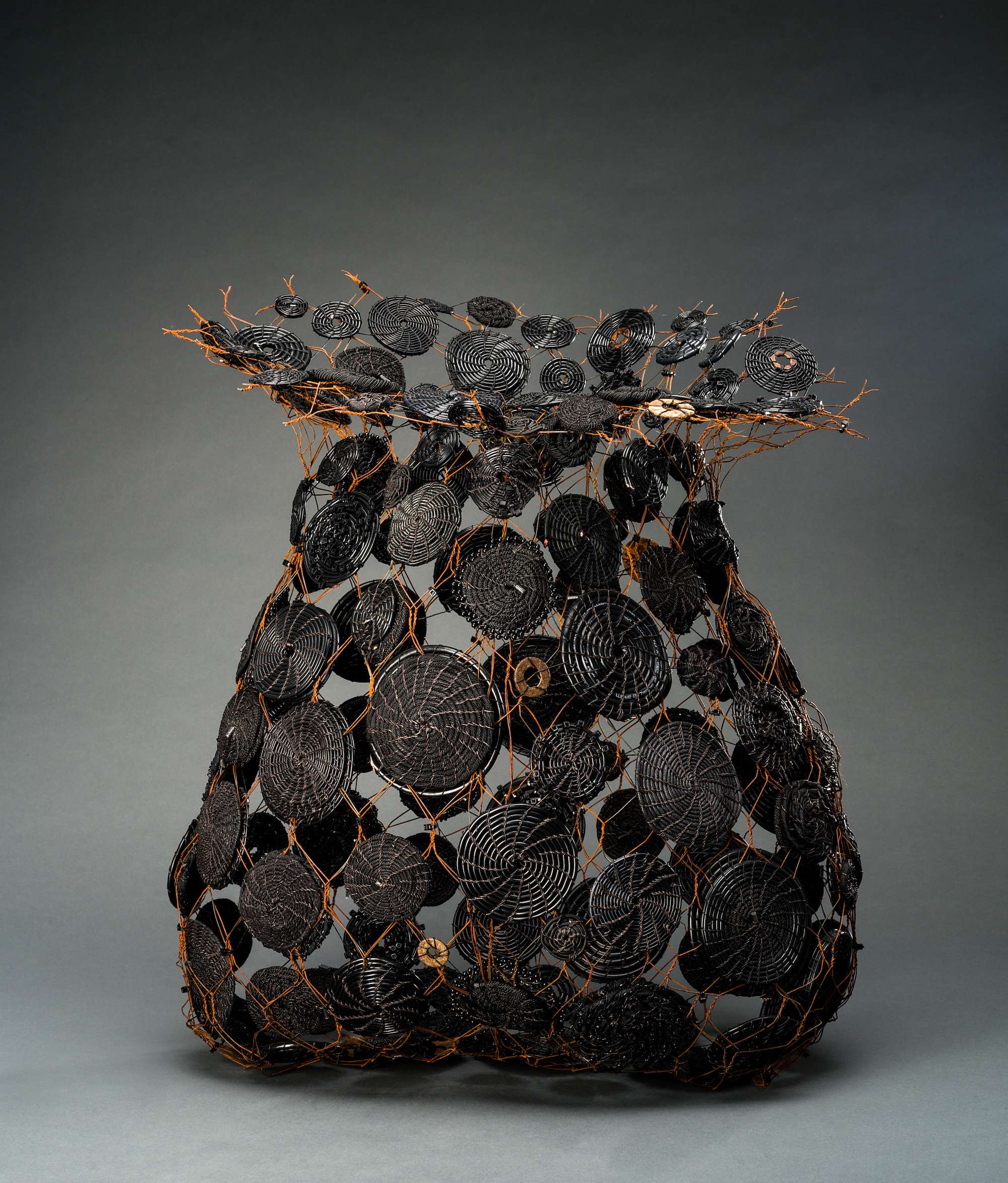 Through basketry, I create “transordinary vessels”, illustrating the concept that even unexpected objects can become works of art. With a visual language, I tell a story by sculpting, weaving, sewing, assembling and coiling. This work references my everyday reaction to the Corona virus over the last couple of years.
