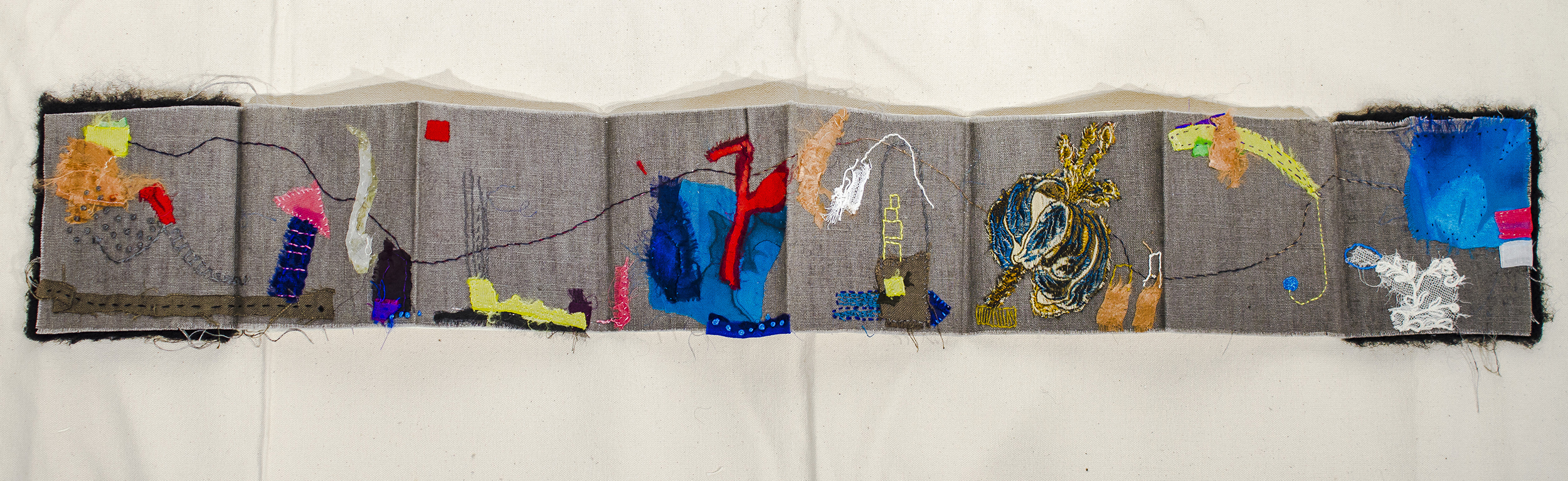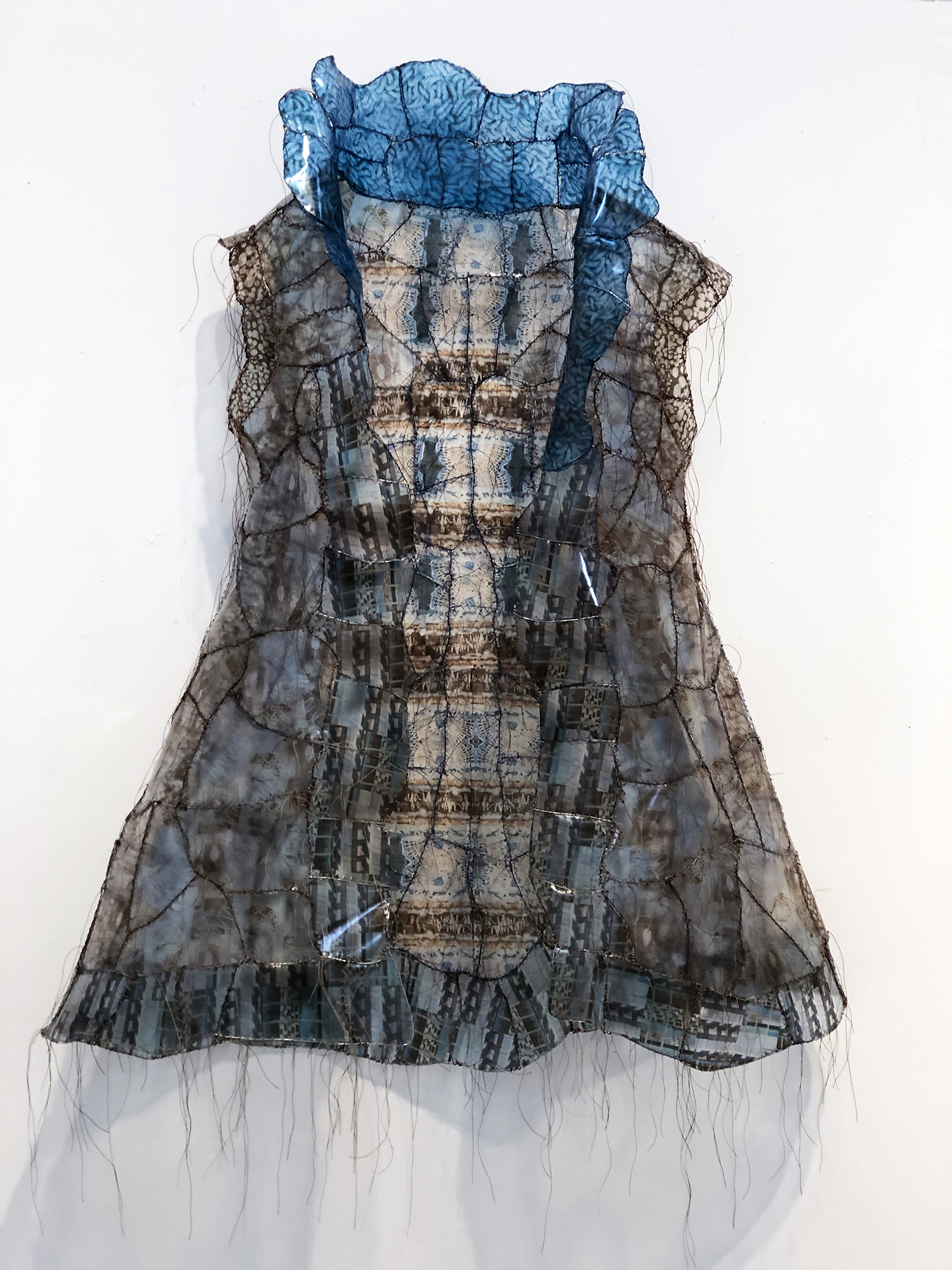 My inspiration comes from nature."Fandango" is the latest in a series of works inspired by lichens, from which I draw and weave shapes of fanciful party frocks, and add embroidered embellishments suggesting the lichen's fruiting bodies. Wall-mounted (not wearable), the dresses are stuffed and manipulated to add dimension.