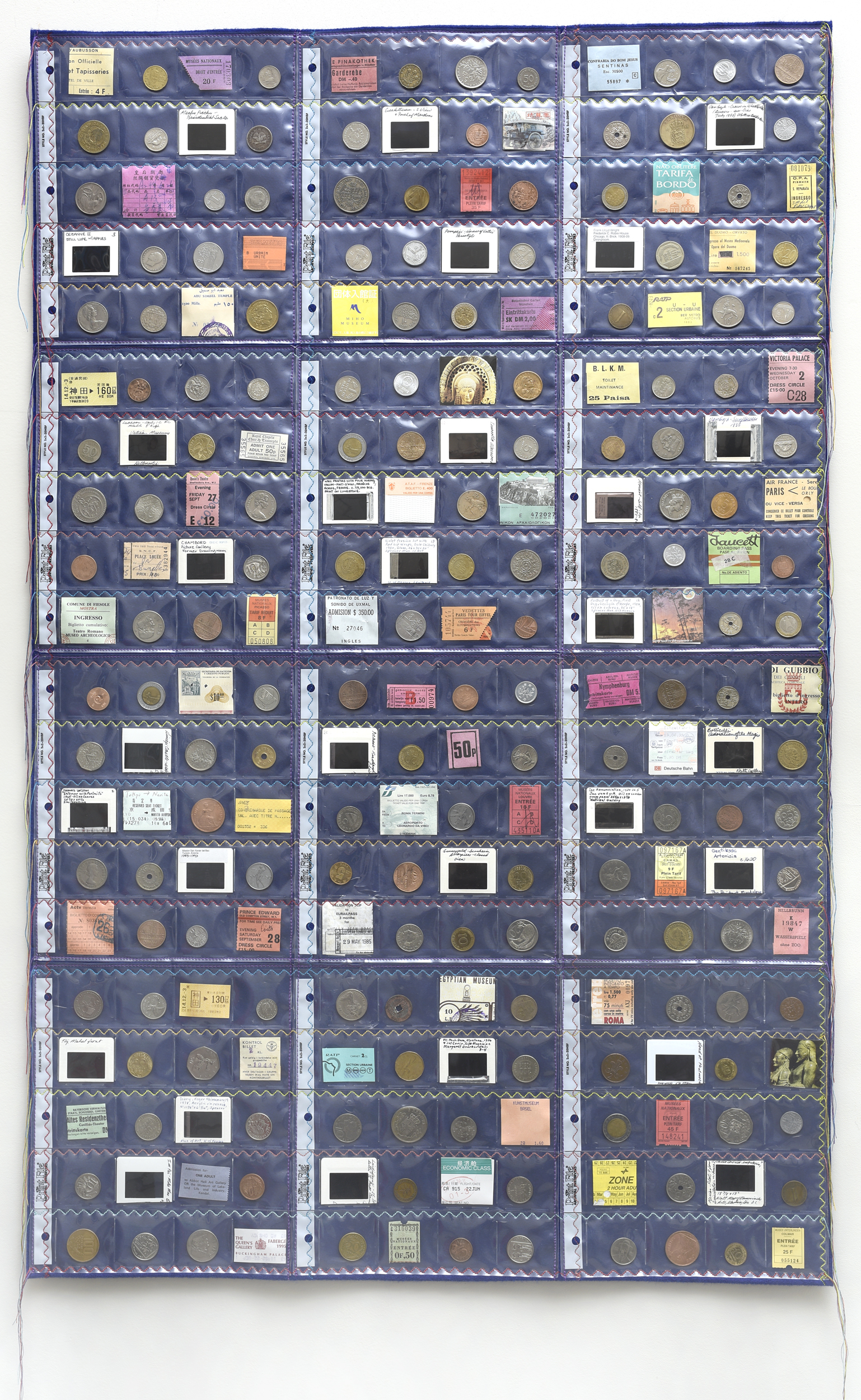 Slide sheets, coins, tickets, slides, thread, felt [44.5 in x 28.5 in]