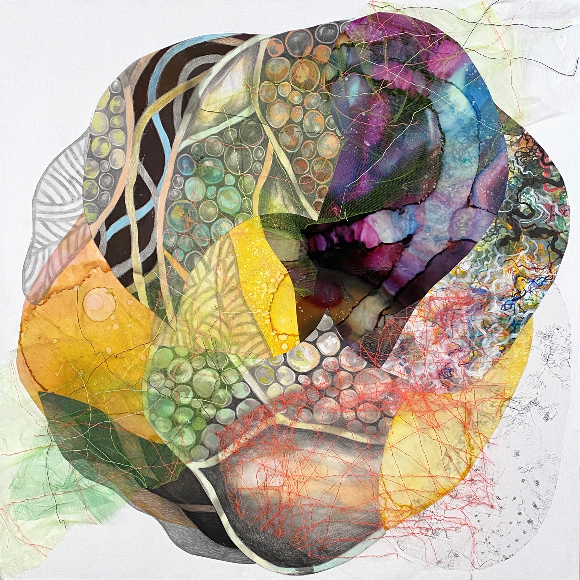 Collaged paintings, drawings and fabric on 24x24 panel [24 in. x 24 in.]