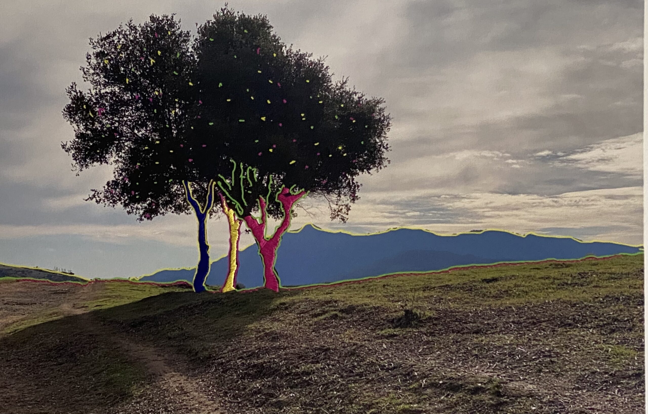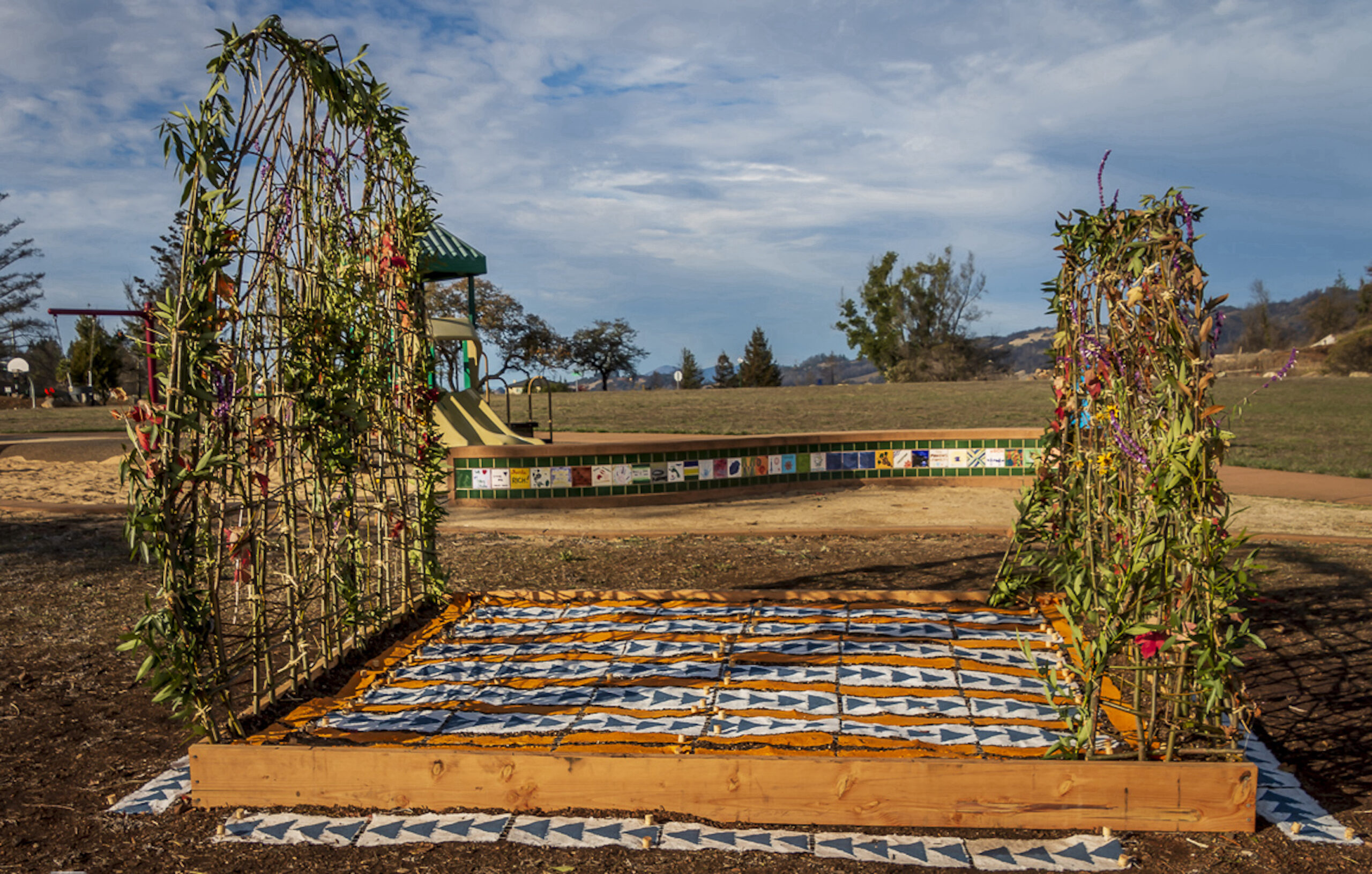 "This work was created as a response to the devastating Santa Rosa wildfires of 2017 to bring new life to the area after the fires. The installation changes over time to become a living blooming wildflower bed, and the paper quilt and branches biodegrade into mulch to nourish the earth. "