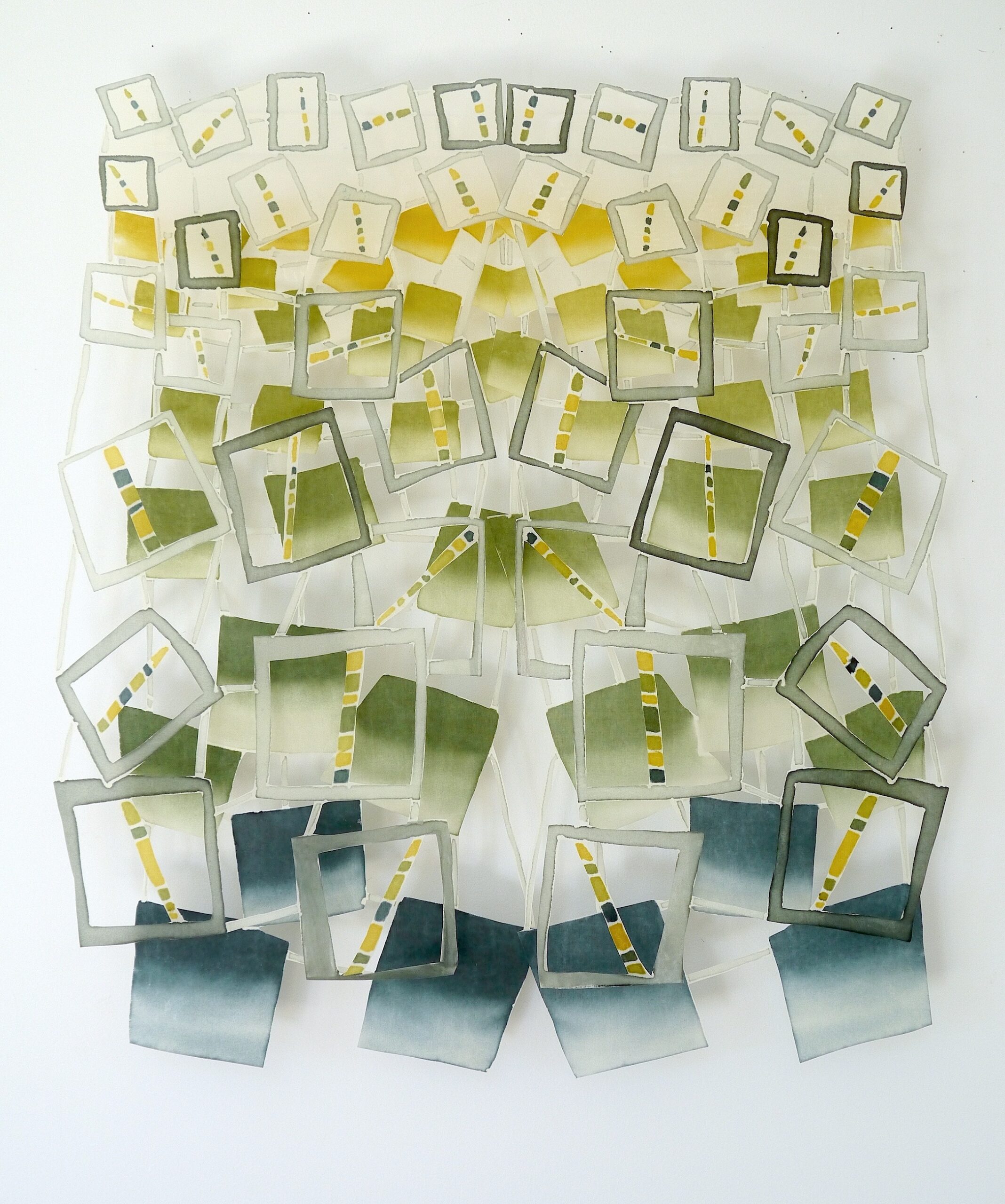 Before printing, I manipulate paper with traditionally textile-based techniques: stitch, shibori tying and pleating to create textured, layered imagery that blurs the line between textile and paper. These techniques emphasize the sculptural materiality of the fiber/paper/ink combination, highlighting the beauty of the translucent Japanese papers I work with.