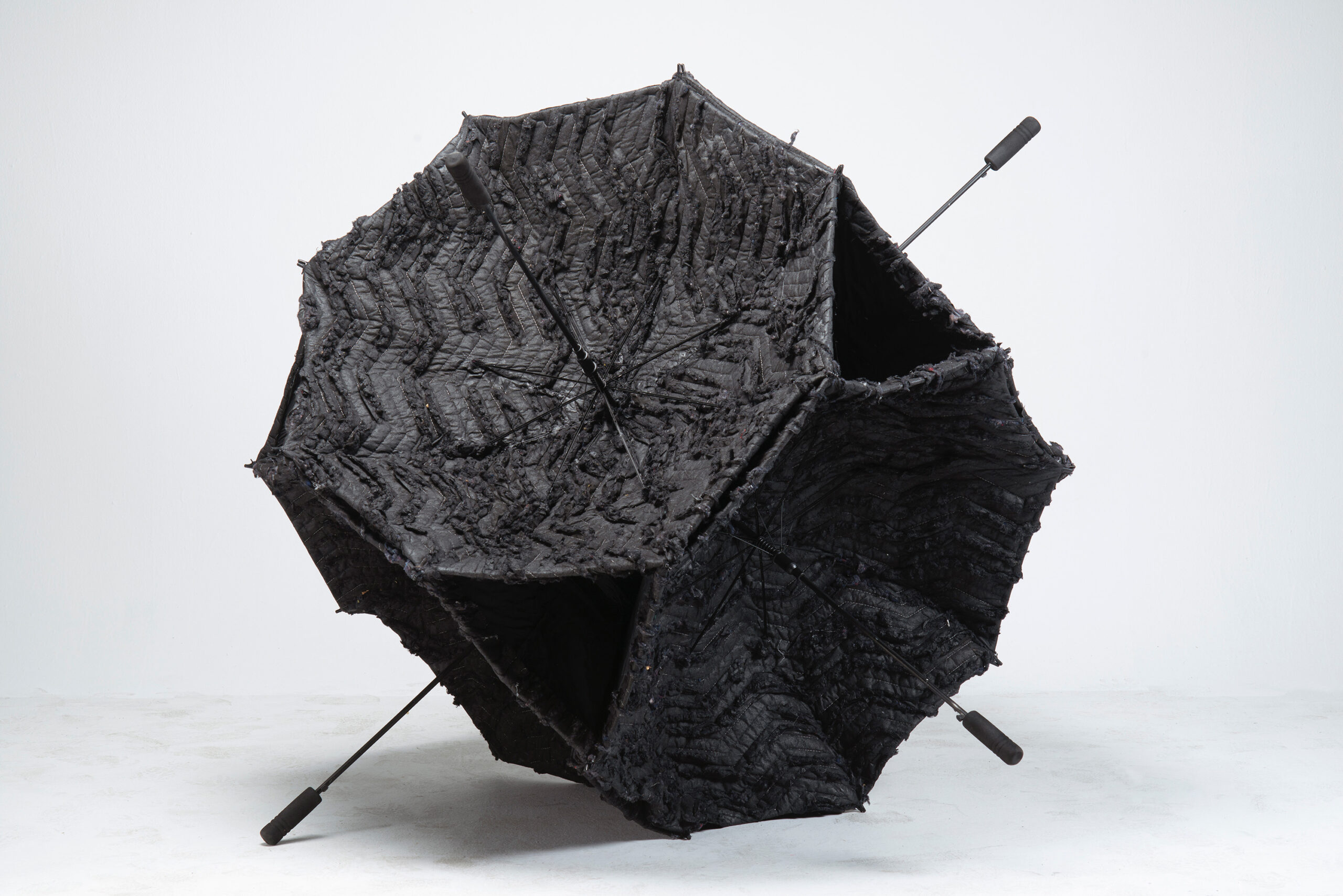 Umbrellas, moving blankets, synthetic polymer paint, zip ties. [72 in x 72 in]