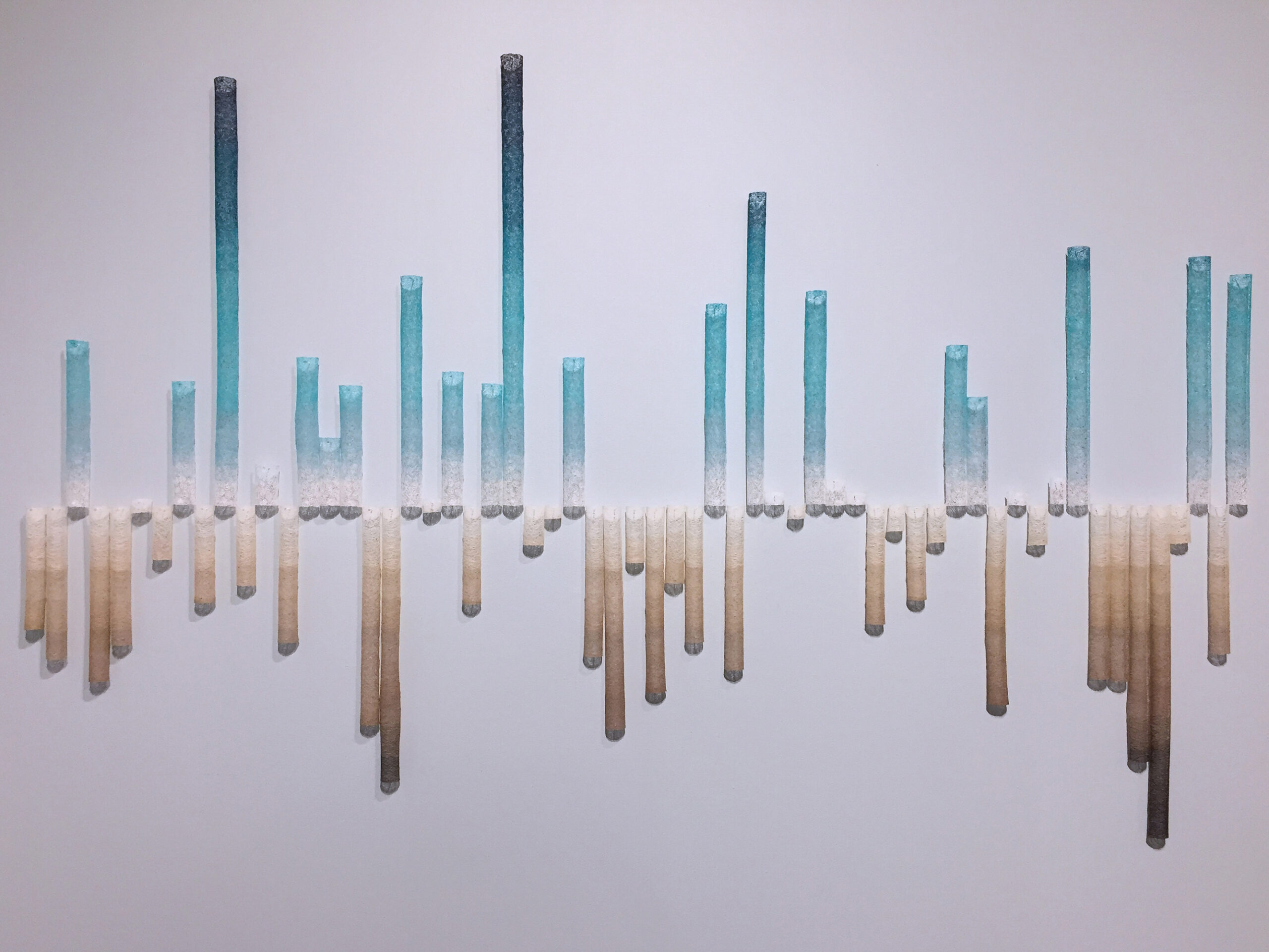 This data visualization artwork shows the average annual snow water equivalent for California 1960-2019. The delicate thread-lace columns are shaped like the snow coring tubes used to take measurements. They show the the downward trend caused by warmer winters as well as highlighting the variations between flood and drought.