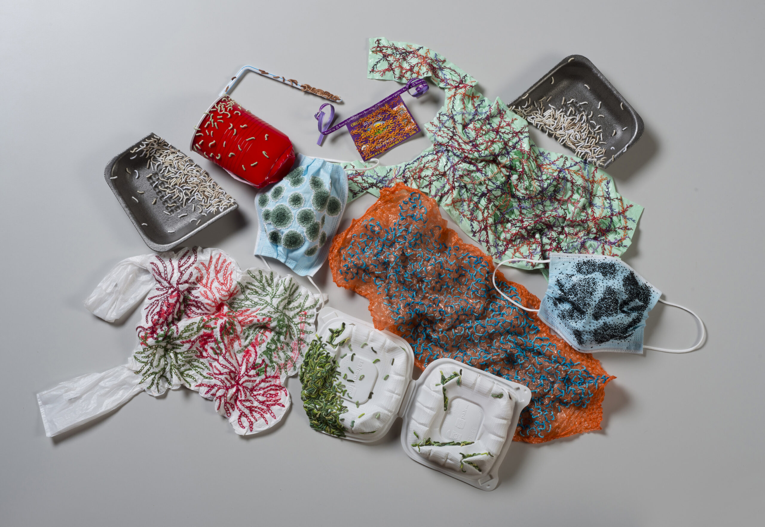 What if organisms evolved to digest the plastic waste accumulating on the planet? I’ve embroidered various single use plastics with stitches that resemble bacteria, fungi, and larvae.