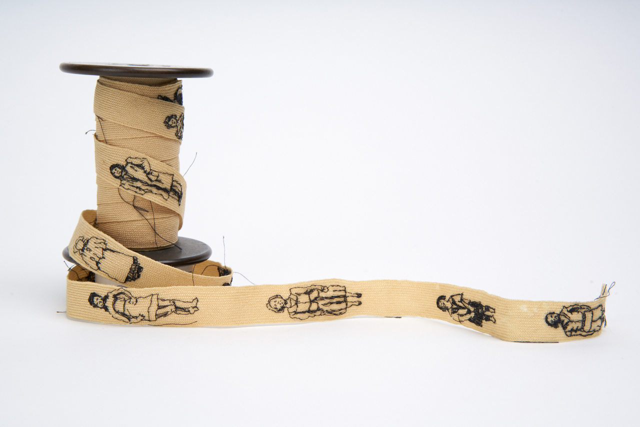 Stitch, thread, vintage woven tape and spool [4.5 in x 2.5 in. variable]
