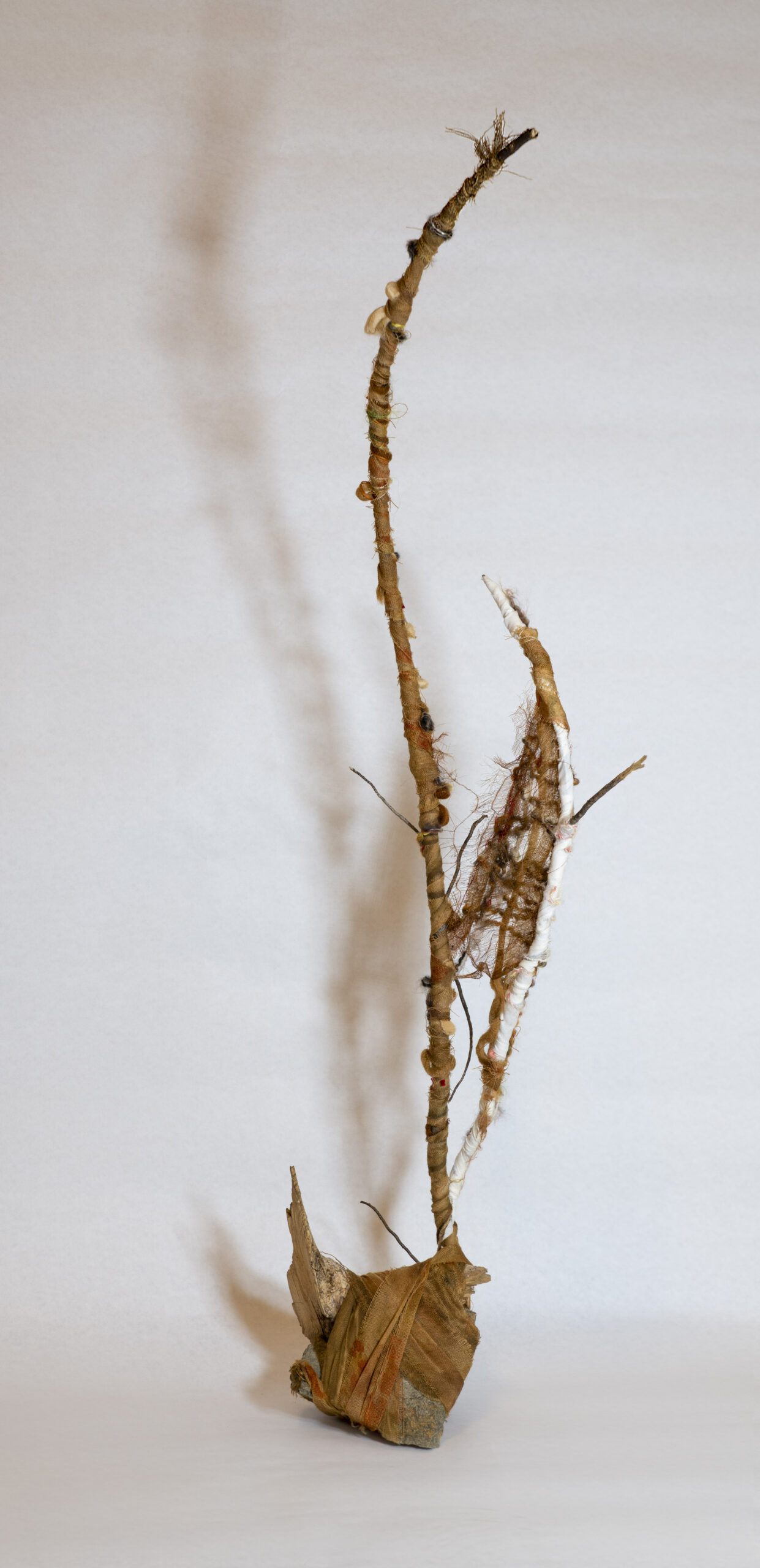 Fabric and thread wrapped wood and stone [42 in x 16 in]
