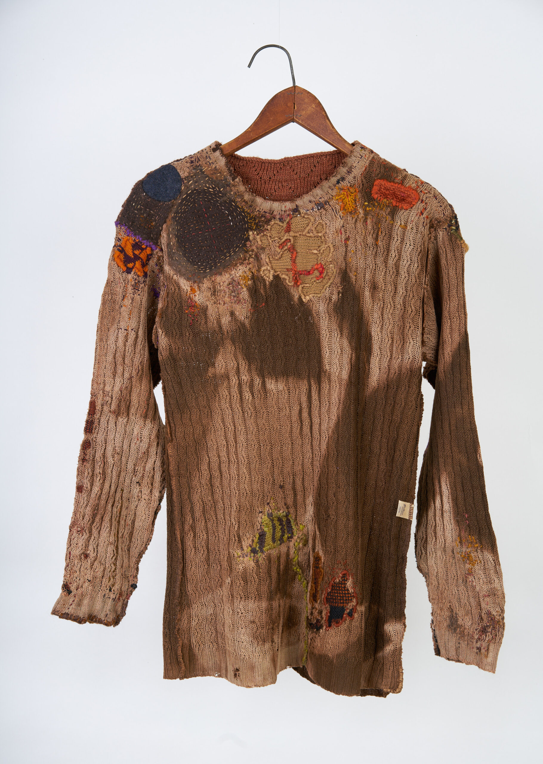 I found this sweater along the railroad tracks, paint splattered, discolored and badly deteriorated. Day workers congregate near there and I imagine this sweater came from one of them. In cleaning and repairing the sweater, I wanted to honor the labor of its former owner with my own.
